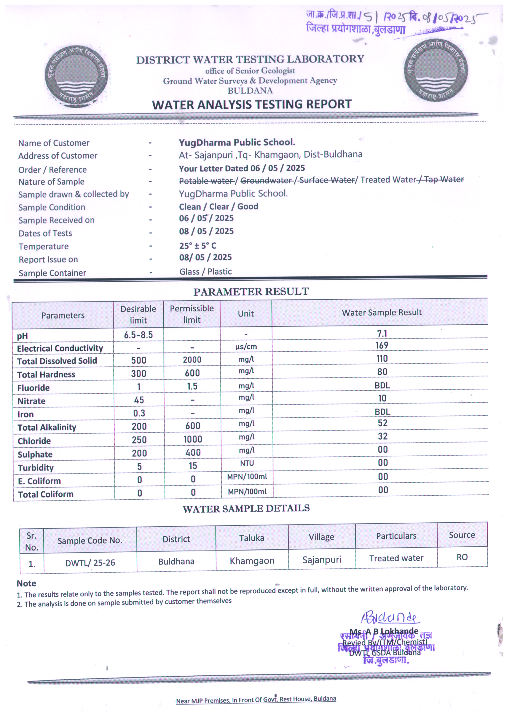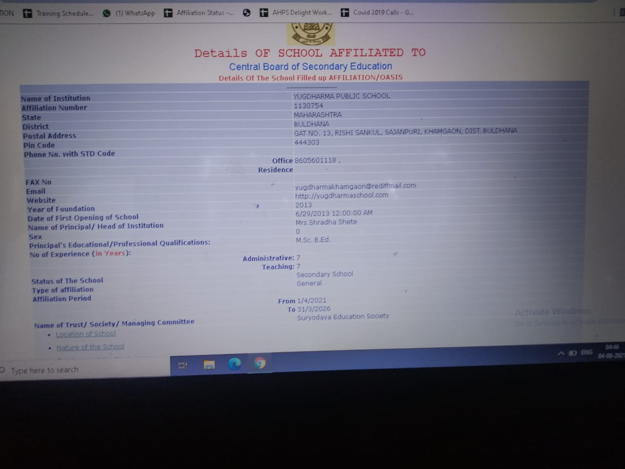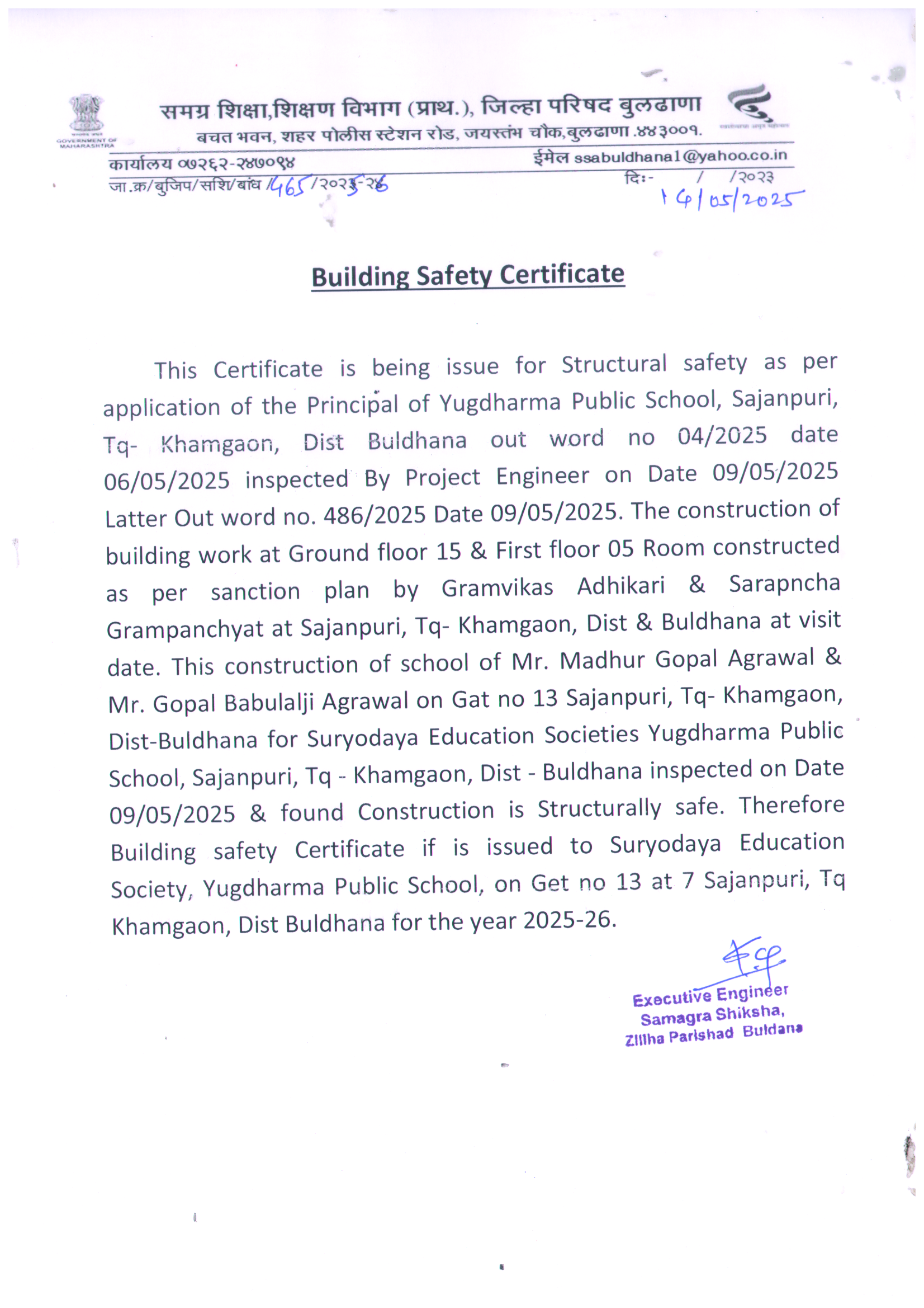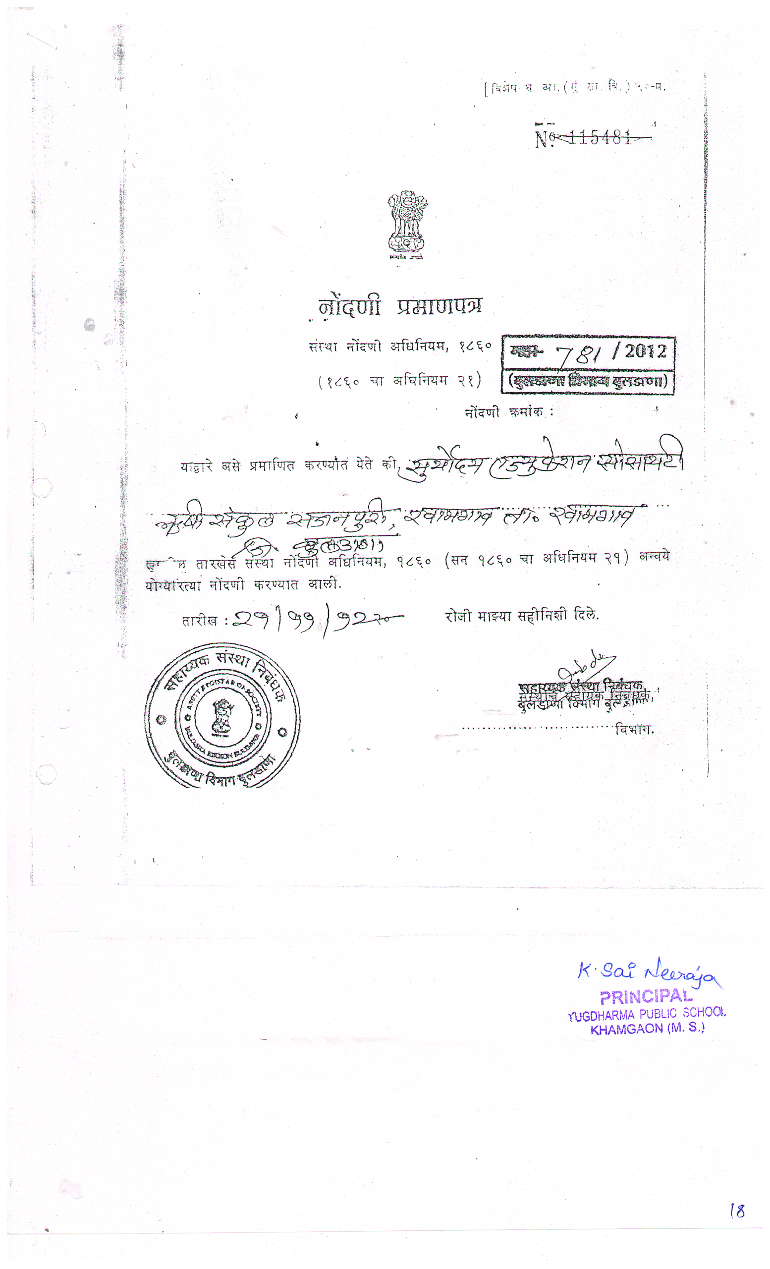 YugDharma Public School Affiliated by CBSE New Delhi .The affiliation No: 1130754 .The affiliation period is from 1-4-2018 to 31-3-2021. It is an English Medium School Managed by Suryodaya Education Society. The school was built in 2 acres of land ,our school code is 45655.